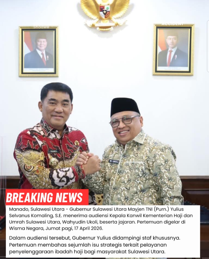 Manado, Sulawesi Utara – MediaPresisi.id —  Gubernur Sulawesi Utara Mayjen TNI (Purn.) Yulius Selvanus Komaling, S.E. menerima audiensi Kepala Kantor Wilayah Kementerian Haji dan Umrah Sulawesi Utara, Wahyudin Ukoli, beserta jajaran. Pertemuan berlangsung di Wisma Negara pada Jumat pagi, 17 April 2026.